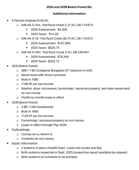 The second home on the property, 2539 Beech Forest, is a 3BR | 2 BA doublewide on an elevated brick foundation with a spacious covered back porch. Privacy and nature abound at this property, with a long gravel drive and a bridge over the meandering brook with massive flat rock features and a tranquil atmosphere. Several useful outbuildings dot the property, and abundant timber provides future income potential.